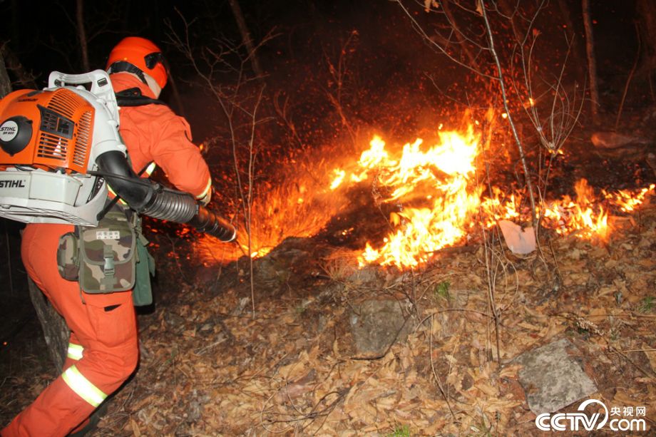 官兵背着风力灭火机,不惧火势强大,奋力扑打火头。