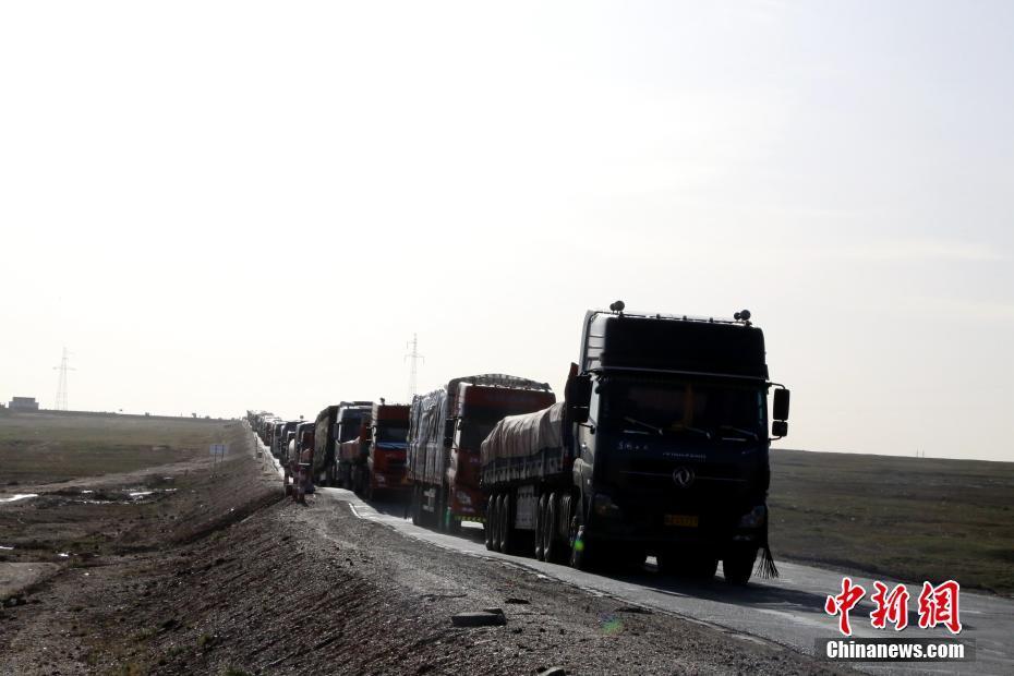 据可可西里管理局五道梁保护站统计,目前已有4000余只母藏羚羊带着出生不久的小羊羔顺利通过青藏公路,回到各自栖息地。图为停靠在青藏公路边的车辆已排成百米长队等待藏羚羊通过。 孙睿 摄