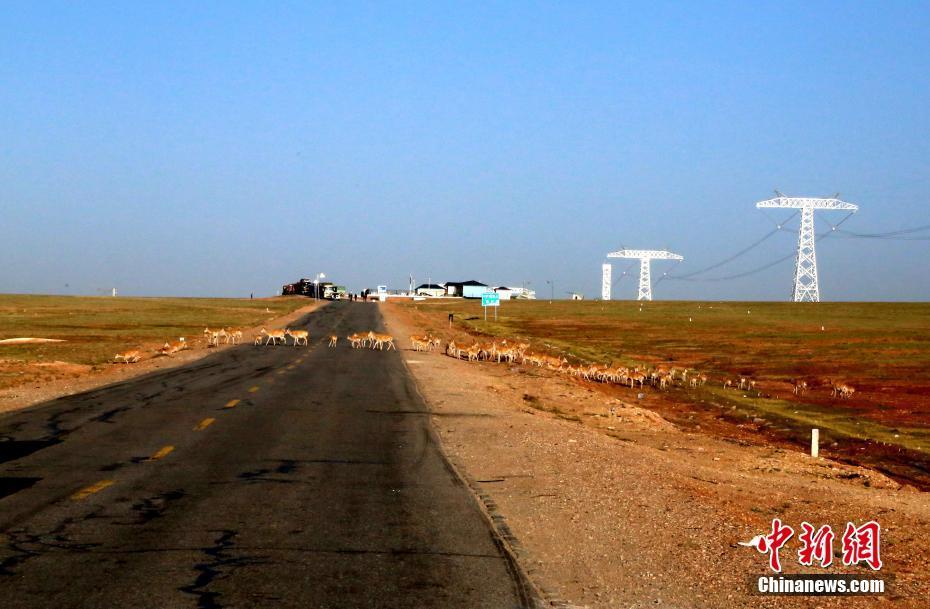 据可可西里管理局五道梁保护站统计,目前已有4000余只母藏羚羊带着出生不久的小羊羔顺利通过青藏公路,回到各自栖息地。图为在青藏公路上,小藏羚羊跟着母藏羚羊一起通过。 孙睿 摄