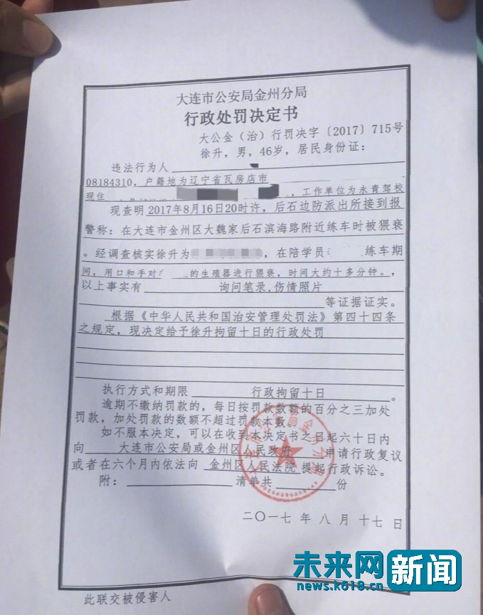 未来网(www.k618.cn)北京8月21日电(记者 刘璐)今日,遭驾校教练性侵当事人李某@阿里山神卤蛋在微博发布了警方提供的行政决定处罚书,处罚书显示涉事者徐升已被决定给予拘留10日的行政处罚。但因发现该教练的工作单位被打错,李某已删除微博回派出所重新打印。
