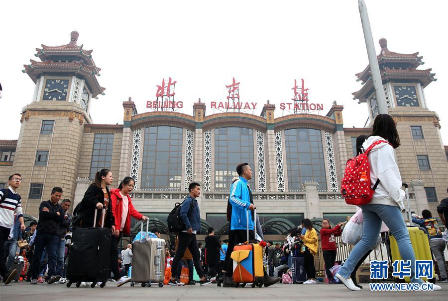 10月7日,旅客经过北京火车站站前广场。随着国庆、中秋假期接近尾声,北京迎来返程客流高峰。新华社发(陶冶 摄)