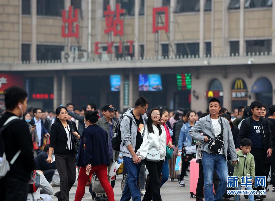 10月7日,旅客经过北京火车站站前广场。随着国庆、中秋假期接近尾声,北京迎来返程客流高峰。 新华社发(陶冶 摄)