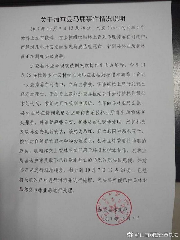 加查县林业局在一份说明中称,按照对自然死亡野生动物处理要求,需要将马鹿的鹿头、鹿鞭移交上级林业部门用于科研和标本制作。
