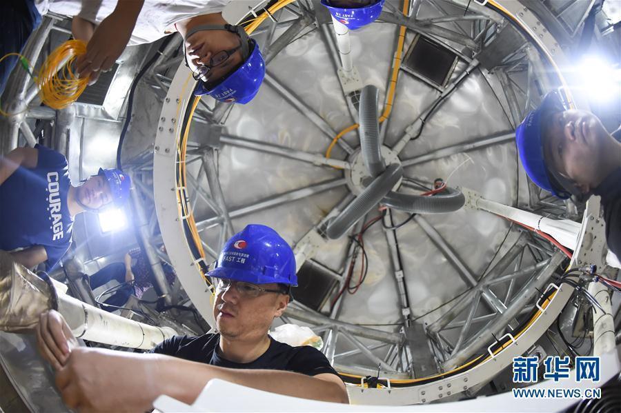 工作人员在FAST馈源舱内工作(8月10日摄)。 10月10日,中国科学院国家天文台宣布,被誉为“中国天眼”的500米口径球面射电望远镜(FAST)经过一年紧张调试,已实现指向、跟踪、漂移扫描等多种观测模式的顺利运行,并确认了多颗新发现脉冲星。这是我国天文望远镜首次发现脉冲星,距“天眼之父”南仁东病逝不到1个月。新华社记者 欧东衢 摄 图片来源:新华网