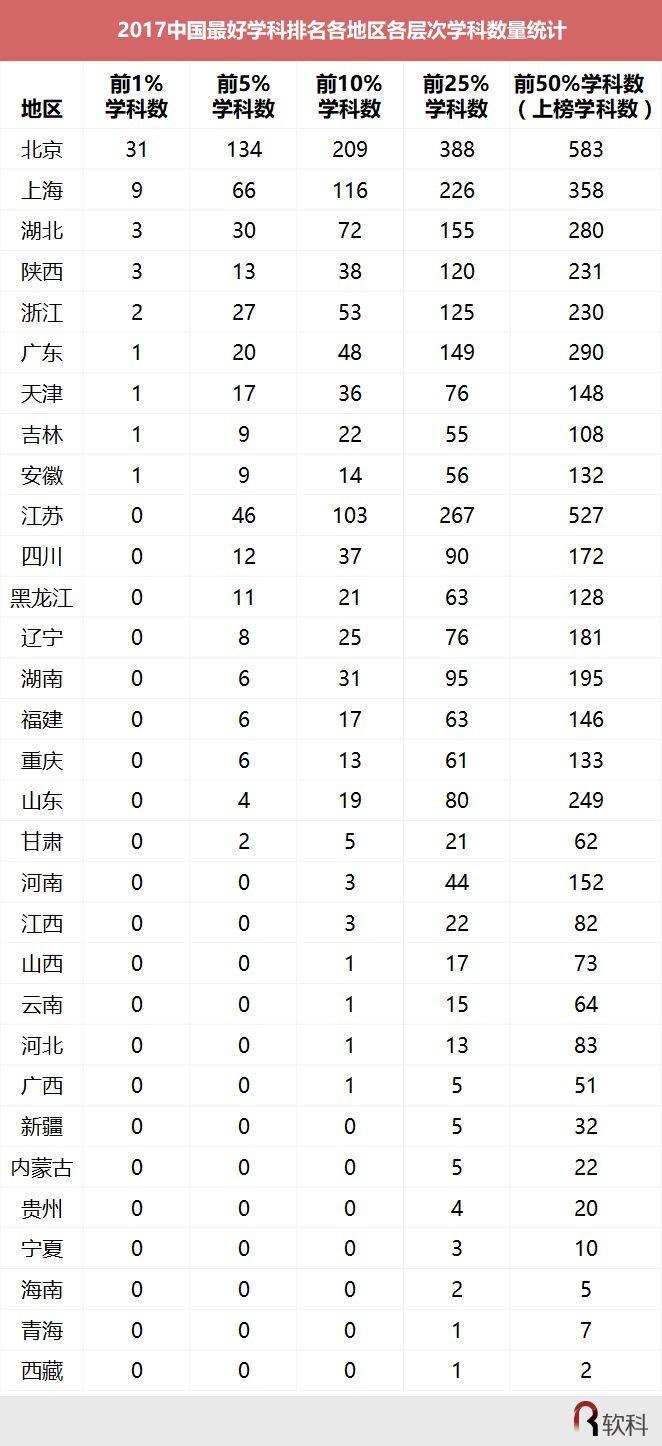 从各省级行政区的上榜学科数量分布看,北京高校占据绝对优势,在1%、5%、10%等各层次的学科数都高居全国第一,毫无悬念领跑。