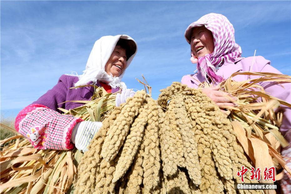 10月13日,位于祁连山下甘肃张掖小米种植专业合作社的农户正在忙碌着收割成熟的绿色有机无公害谷子。金秋时节,甘肃张掖十万亩谷子喜获丰收,农民们忙着收获,田野里、农家院里一派丰收忙碌的景象。 王将 摄