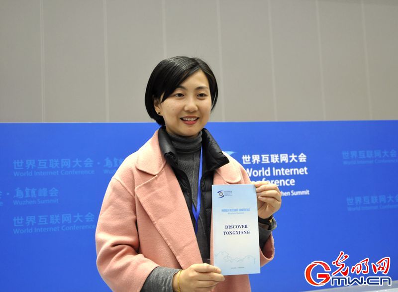 “桐宝宝”张潘丽已经是第四年参加世界互联网大会宣传服务工作了,她在朋友圈说,“一年一打卡,又进入乌镇时间了”。(李政葳/摄)