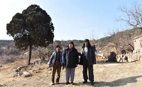 2017年12月16日,在山东省日照市岚山区中楼镇崔家峪村北的一座大山上,王京桂(音)和两个儿子刘延灵(音,右)、刘延启(音,左)在家门前一棵百年柏树前合影。据刘延灵介绍,他们家世代在这座大山上居住,至今已经7代了。