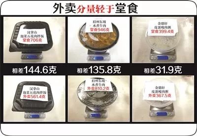 此前,北京青年报记者随机选取吉野家、汉拿山、眉州东坡等外卖销售量较大的10家知名连锁餐饮进行调查。调查结果显示,10个样本中有8个样本存在外卖分量少于堂食的情况,其中分量最多可相差近150克,相当于五分之一菜量。