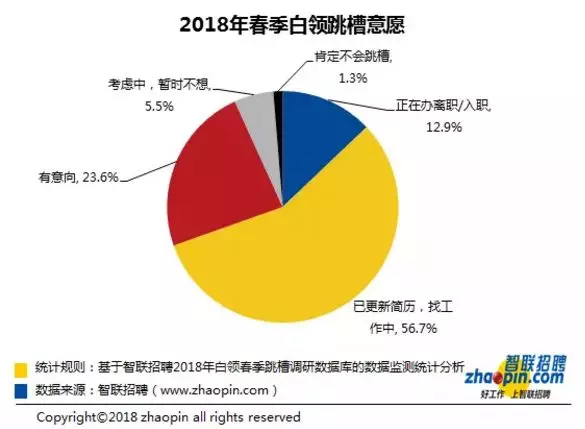 智联招聘的2018年跳槽意愿调研显示,12.9%的白领正在办理离职/入职手续,56.7%的白领已更新简历正在求职,也就是说在跳槽季积极行动的白领比例高达69.6% ;此外,23.6%的白领表示有跳槽意向,故总共有93.2%的白领有跳槽意向。 暂时不想或肯定不会跳槽的白领仅占6.8%。