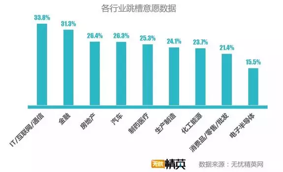 而无忧精英网上月发布的职场精英2018年春季跳槽意愿报告则显示出了跳槽者的行业分布。在此项调查中,来自IT互联网行业的白领们“跳槽率”较高,金融、房地产、汽车行业紧随其后。