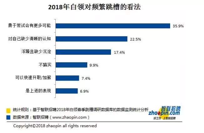 智联招聘在报告中提到,在跳槽频率方面,有19.1%的白领表示,平均1年以内就要跳槽一次;34.8%的白领表示自己1-3年内会跳槽一次,即53.9%的白领不满3年就要跳槽一次。 数据显示,35.9&的白领认为频繁跳槽意味着更多的可能和机遇。