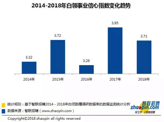 针对跳槽找工作的难度调查显示,白领认为今年找工作比较容易,信心指数为3.71。女性此项得分为3.27,高于男性的3.07。智联招聘在以往的调研中发现,女性换工作时考虑的因素较多,且较为保守,在新工作与自己匹配度较高时才会有所行动,充足的前期准备也是自信的来源。
