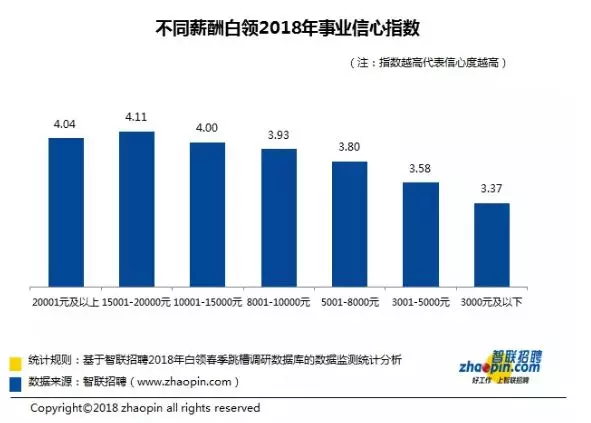 从数据上看,收入15000-20000元和20001元以上的白领,信心指数高达4.11和4.04,而收入3000元以下白领的信心指数只有3.37。(中新经纬APP)