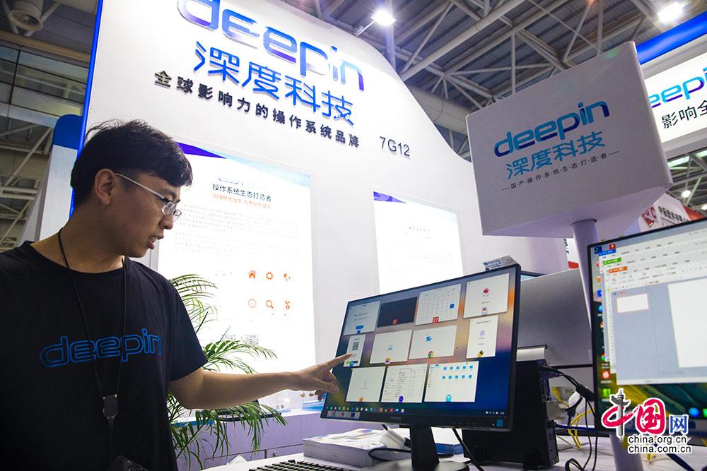 一名工作人员介绍国产Linux操作系统——深度操作系统。中国网记者 张若梦 摄