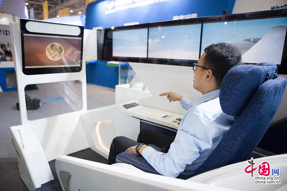 4月21日,在中国商飞展区,一名工作人员正在测试C919飞机概念舱段。把手放在手势控制器上,就可以控制屏幕。中国网记者 伦晓璇 摄