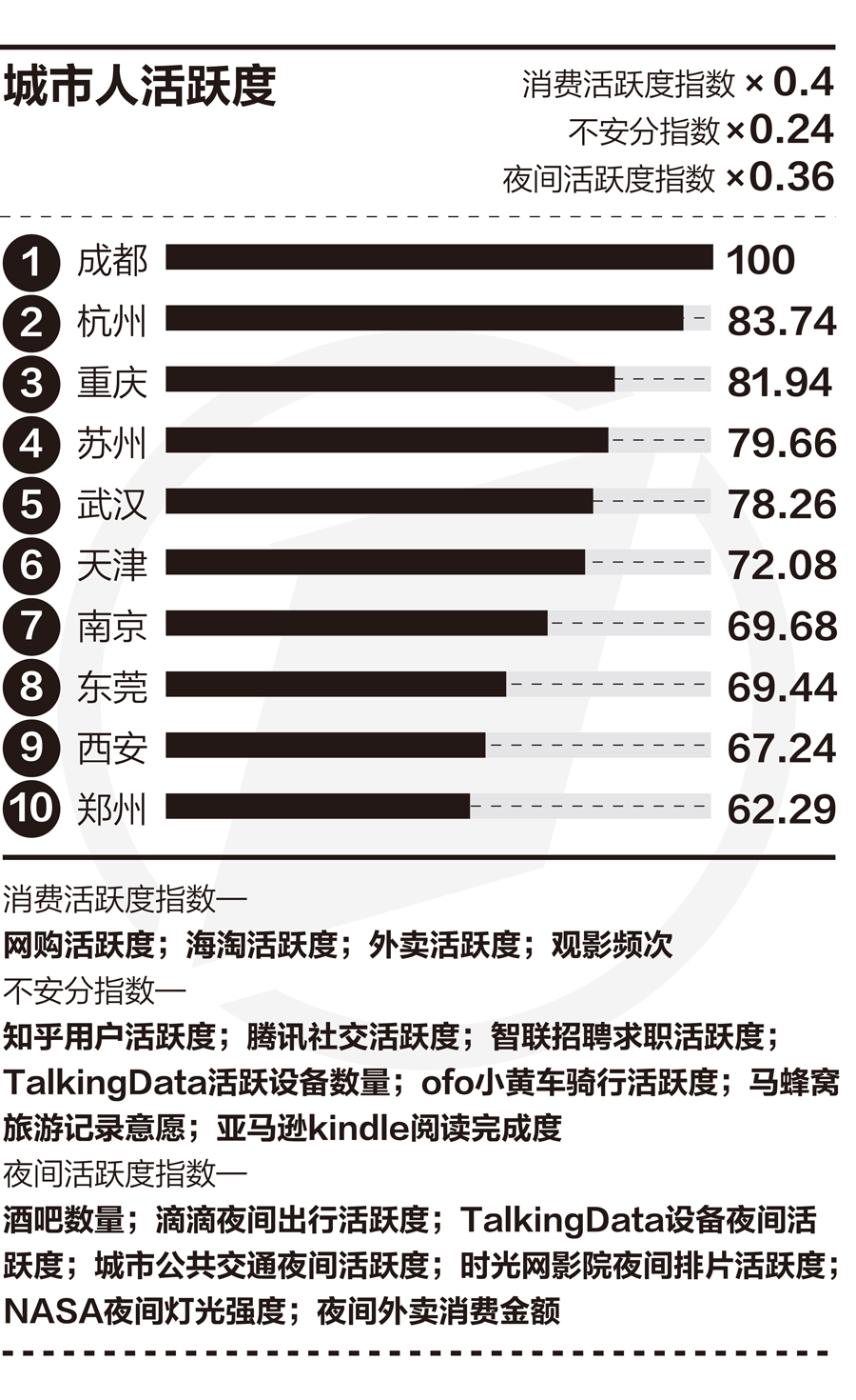 不安分指数衡量的是城市向上生长更新的欲望,它代表了一种积极的生活状态。成都是不安分指数最高的新一线城市。成都人乐于在旅行平台上分享自己的旅游记录,也迅速接纳了新生的共享单车,并保持着很高的日常骑行活跃度数据。