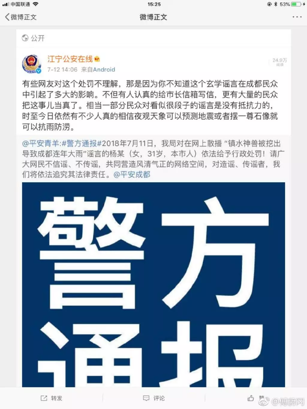 2018年7月11日,@平安青羊发布警方通报,对在网上散播“镇水神兽被挖出导致成都连年大雨”谣言的杨某(女,31岁,本市人)依法给予行政处罚。