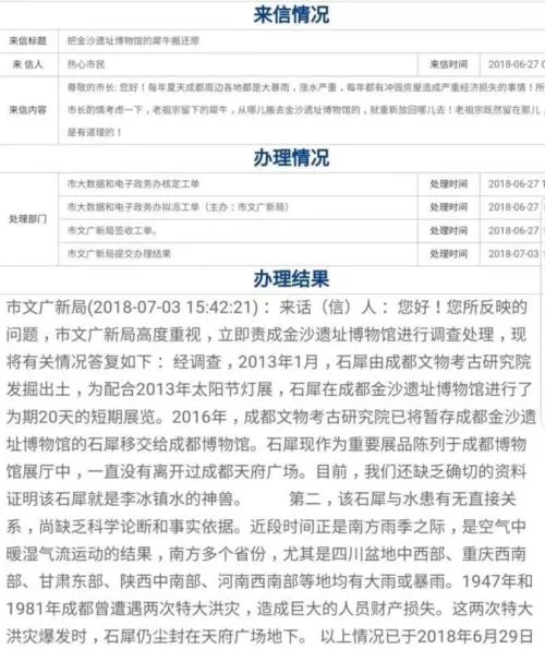 1、网上盛传的关于石犀的来信办理截图属实,系成都市文化广电新闻出版局通过成都市人民政府门户网站的市长信箱正常回复热心市民的内容。