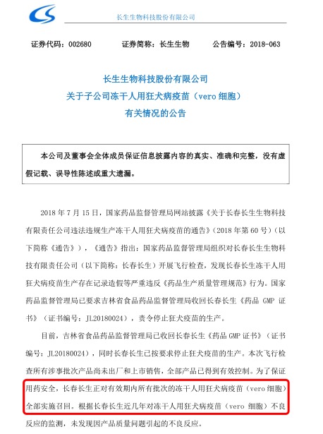 7月16日早间,长生生物发布公告称,长春长生对有效期内所有批次的冻干人用狂犬病疫苗全部实施召回。“长春长生对此次事件的发生深表歉意。长春长生将密切跟踪事件进展,积极配合国家药品监督管理局、吉林省食品药品监督管理局等相关监管部门开展后续工作,严格按照中国证监会、深圳证券交易所的相关规定履行信息披露义务。敬请广大投资者注意投资风险。”