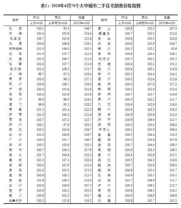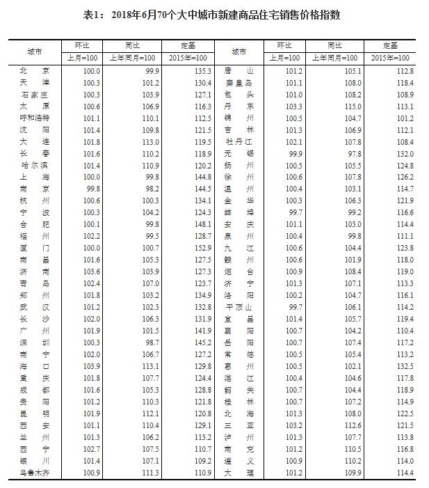 2018年6月份70个大中城市商品住宅销售价格变动情况