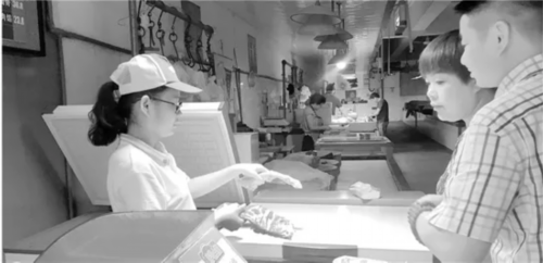 “我还记得第一天,要拿着猪肉跟客人介绍,每一次拿起放下,都想要洗手。”后来她也习惯了,趁着送走一批客人得闲的时候去洗一次手,“没那么娇气,也没那么讲究。”