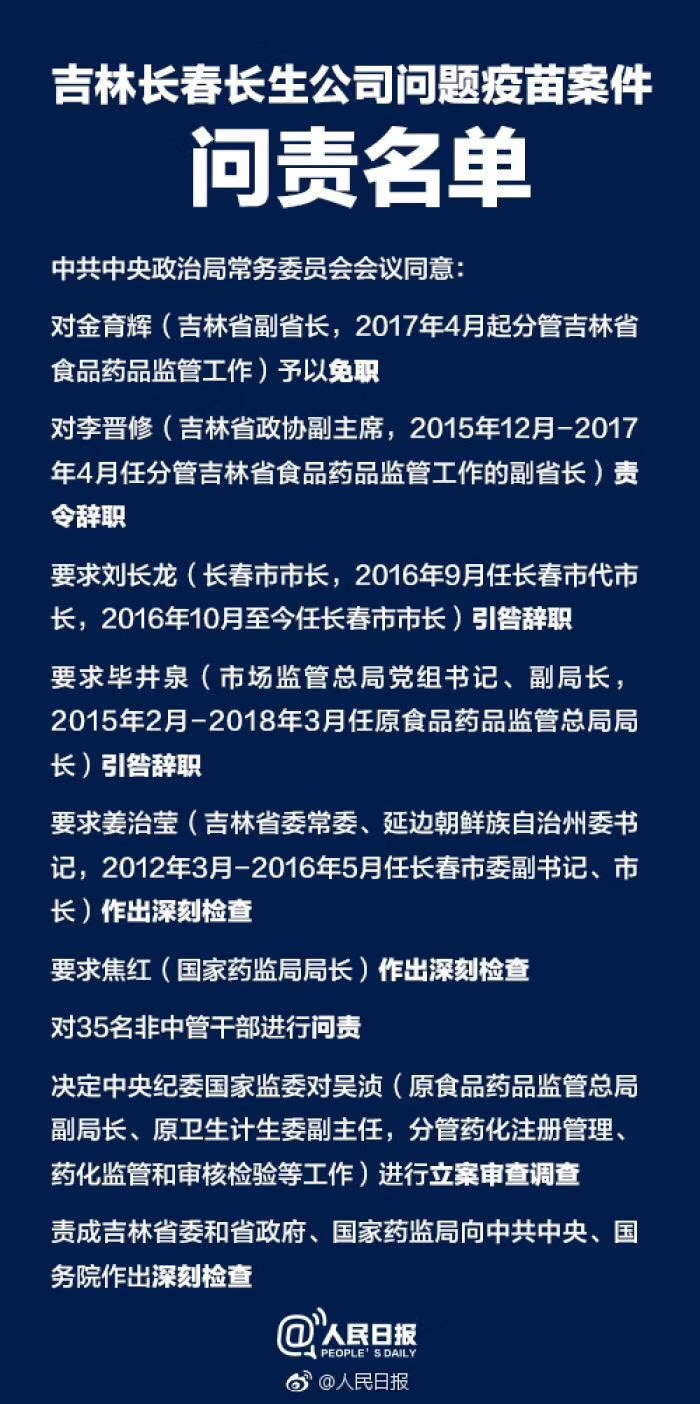 “会议同意,对金育辉(吉林省副省长,2017年4月起分管吉林省食品药品监管工作)予以免职,对李晋修(吉林省政协副主席,2015年12月-2017年4月任分管吉林省食品药品监管工作的副省长)责令辞职,要求刘长龙(长春市市长,2016年9月任长春市代市长,2016年10月至今任长春市市长)、毕井泉(市场监管总局党组书记、副局长,2015年2月-2018年3月任原食品药品监管总局局长)引咎辞职,要求姜治莹(吉林省委常委、延边朝鲜族自治州委书记,2012年3月-2016年5月任长春市委副书记、市长)、焦红(国家药监局局长)作出深刻检查;对35名非中管干部进行问责;决定中央纪委国家监委对吴浈(原食品药品监管总局副局长、原卫生计生委副主任,分管药化注册管理、药化监管和审核检验等工作)进行立案审查调查。会议责成吉林省委和省政府、国家药监局向中共中央、国务院作出深刻检查。”