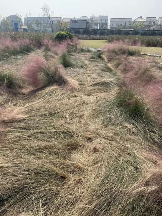 踩踏过的地方已经没有粉红色,类似于普通的黄色草垛子。残存的粉黛草被强硬得向一边弯折,粉红色的穗子挨到地面,杆子上是一个个或被躺或被靠的身体痕迹。有的草中夹杂着风干的橘子皮等。