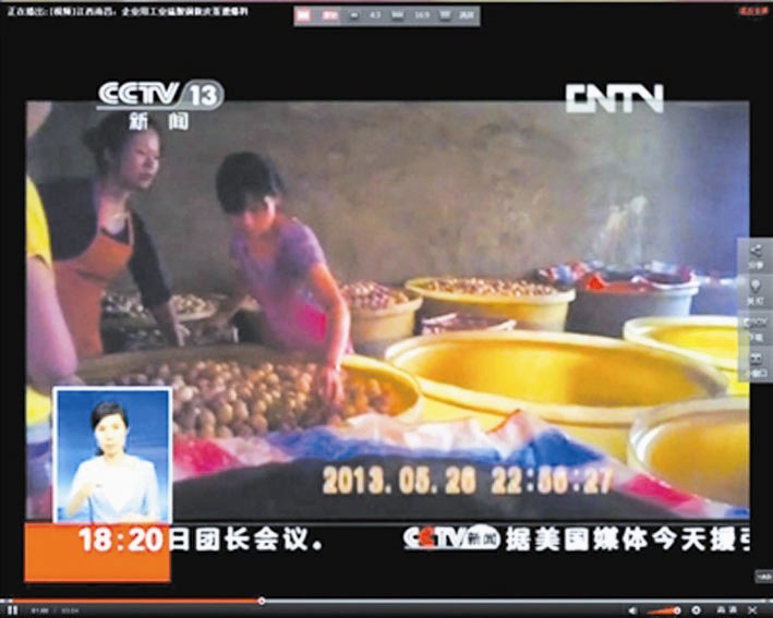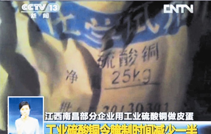 图为:一家皮蛋加工厂使用的硫酸铜化学试剂 央视截图
