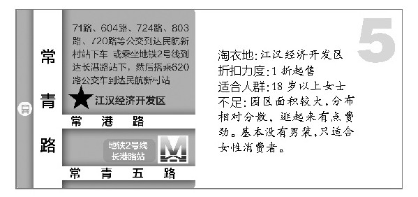 江汉经济开发区,位于汉口民航新村中百仓储常青店正对面。区内云集了众多汉派服装企业,大多为女装,如太和、尚缇诗、蔻玲、朵拉·伊莎贝拉、麦勒菲等,另有少数内衣品牌如爱帝。因园区面积大,故分布不是很集中。记者昨日下午花费三个小时才大致将各折扣店逛完。