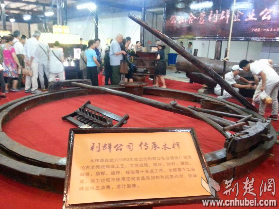 在一楼展厅,记者看到,在利群公司的传统木榨工具前聚集了众多民众,据介绍,木榨是古老的传统的制油工艺,工艺流程包括筛子、炒籽、碾粉、踩饼、插楔、撞榨、接油等十多道工序,全部手工完成,原汁原味。