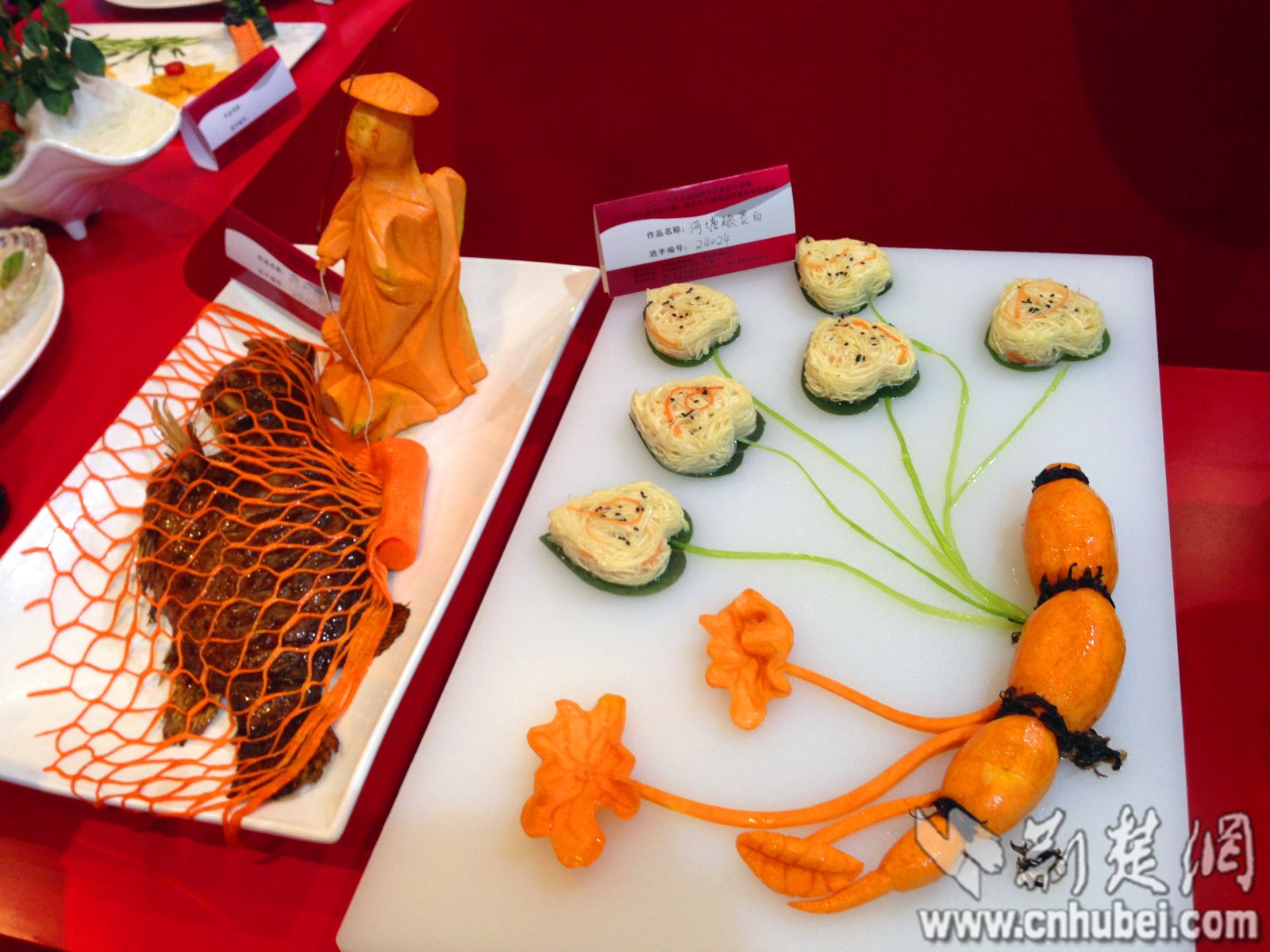 在鄂菜展示区,武汉艳阳天、湖锦、亢龙太子等酒店推出的240多道精品菜肴,每道菜都像一件装饰品,色香味形俱全,引得市民驻足。