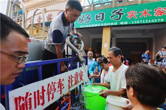 8月1日上午9点过,祥余林苑的100多户人家就在小区大门口排队等候,水桶、脸盆、铁壶排成了一字长蛇阵。业主委员会主任、74岁的万州人李德银告诉慢新闻-重庆晚报记者:已经连续停了4天4夜的水,大家向镇政府求助后,前一天开始政府就派来了水车给大伙儿应急。不过,对大量老人儿童来说,怎么把水提到楼上去,也是个不小的考验。