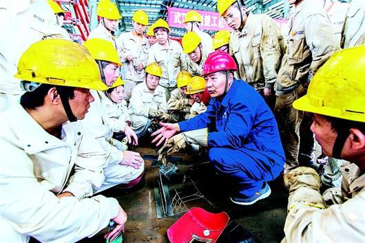 湖北日报讯 武汉市总工会联系“荆楚工匠”赵宗合、周虎,到武汉龙净环保科技公司收徒授艺。图为昨日赵宗合指导新收的两名徒弟及其同事,进行电焊技术要领示范。(记者 梅涛视界网 胡文辉摄)