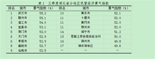 三季度,我省15个地、市、州民营经济景气指数在荣枯线水平上运行,表明各地区民营经济发展总体处于景气状态。武汉、随州、潜江、宜昌、荆门、天门、孝感地区民营经济景气指数高于总指数。