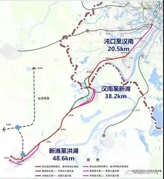 另外,查阅资料发现,去年发布的武汉市轨道交通线网规划修编(2014-2049年)中,已经规划了武汉地铁16号线通往洪湖方向的线路(如下图)。