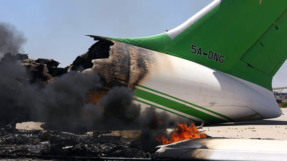 7月16日,在利比亚的黎波里,一架飞机遭火箭弹击中损毁。