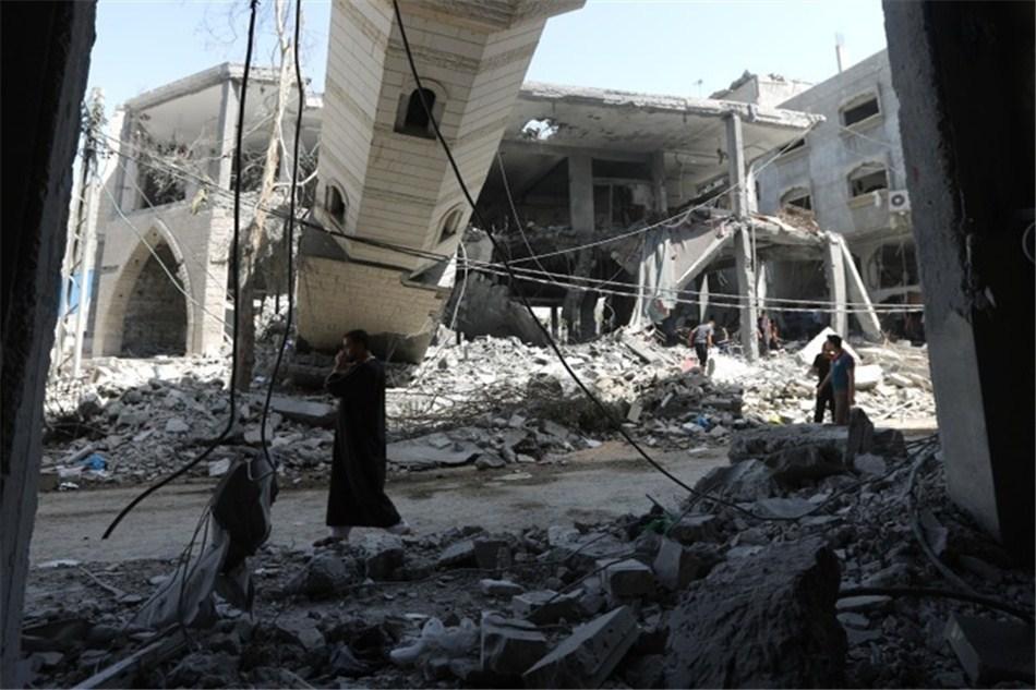 7月30日,在加沙城北部沙提难民营,巴勒斯坦人从一座被以军炸毁的清真寺旁经过。自7月8日以来,加沙地带数十座清真寺、医院和联合国学校遭到以军轰炸,以军称当时有武装分子在附近发射火箭弹。图为巴勒斯坦人从一座被以军炸毁的清真寺旁经过。