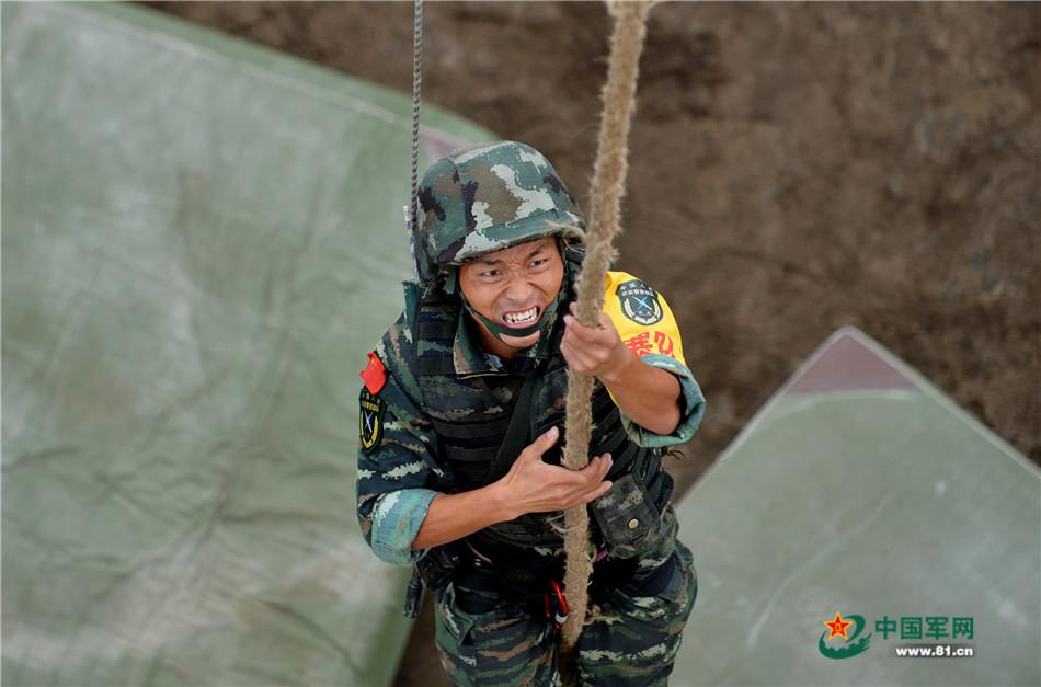 9月21日,在武警重庆总队八支队综合训练场,特战队员在进行特种攀登课目竞赛。