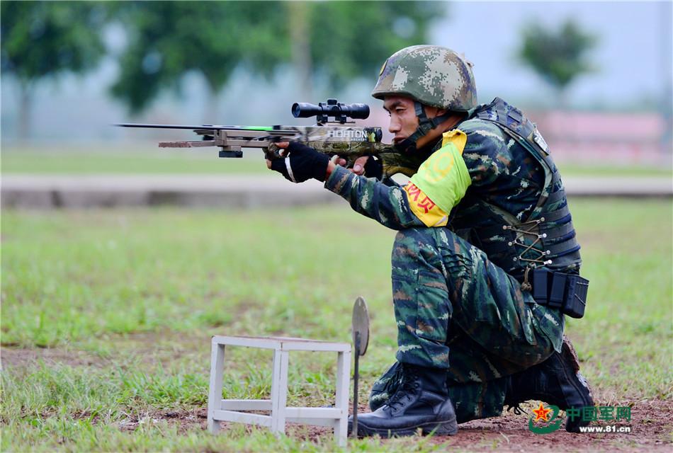 9月21日,在武警重庆总队八支队综合训练场,特战队员在进行弓弩射击课目竞赛。