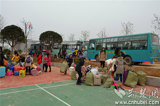 图为:华中师大来凤附中学生正在将行李搬运到新校区