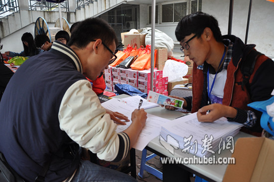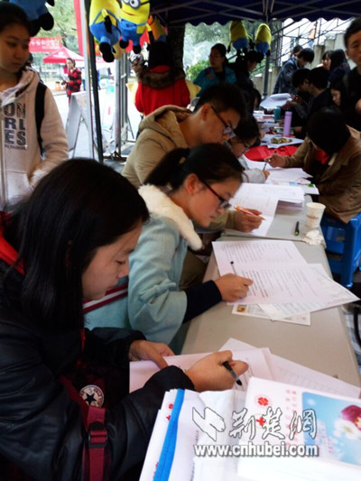 寒风冷雨阻挡不住中南财经政法大学首义校区的爱心学子们,他们积极填表留样,加入中华骨髓库。据了解,中南财经政法大学首义校区都是大一学生,共有3000余人。上午9点半,中南财经政法大学工商学院志协的志愿者们就忙开了,给路过的学生们发宣传单,为采样填表学生提供引导服务。