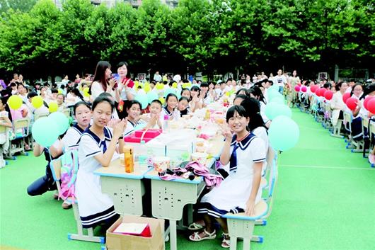 276名毕业生最后一次穿着校服与同学聚餐,孩子们都兴奋极了:有人提来了大蛋糕,有人搬来了大西瓜,有人端出了老妈的拿手好菜……孩子们一边开怀畅吃,一边到广播室点歌,为自己、同学、恩师、学校送上祝福。