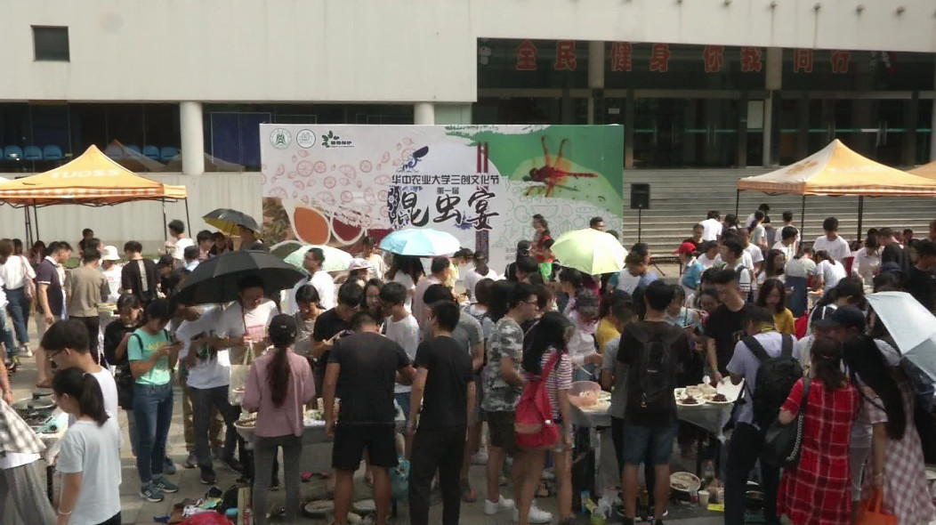 昨天下午,华中农业大学体育馆的操场上,架起了十几套炊具,该校植科院的数名学生一身厨师打扮,以各种虫子为食材,煎炒烹炸,各施手艺,共烹昆虫宴。