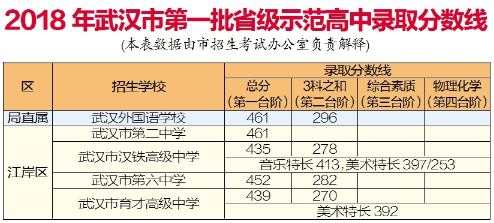 华师一附中录取线为478分,比去年低15分;武昌实验中学录取线为463分,比去年低20分;武汉外校录取线为461分,比去年低12分;武汉一中录取线为453分,比去年低14分。
