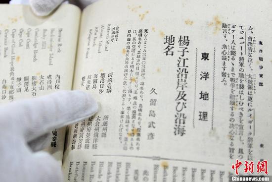 1月24日,收藏家罗玉其在长沙天心阁古玩城展示了一本珍藏多年、日本博文馆发行的《东洋战争纪实》。书中的东洋地理清楚的记载了“清国名称、所属州县,钓鱼台黄州府蔪州”等字样。中新社发 杨华峰 摄