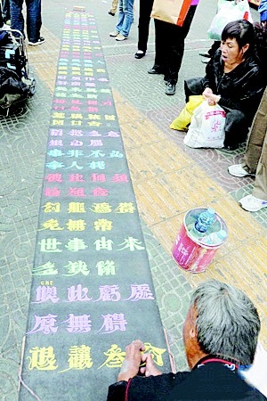图为:“粉笔哥”崔显仁在街头写的字。(资料图片)