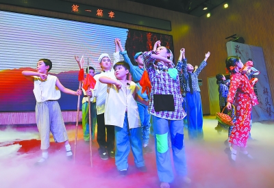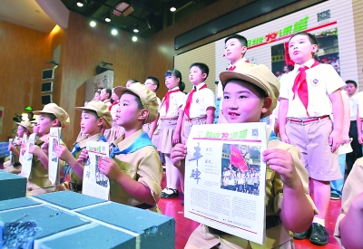8月29日上午,汉版《开学第一课》在江汉区红领巾学校录制。左图:学生们朗诵抗战诗词《在太行山上》。右图:中小学生代表收到《超级课堂》抗战特刊。 记者郭良朔 摄 (实习生黄骋)
