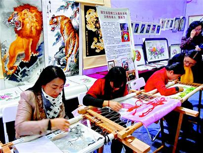 湖北日报讯 26日,由新华社发起的“中国网事·感动2015”第四季度网络人物评选活动落下帷幕,武汉市省级首席工艺美术大师汉绣传承人黄春萍(左)入选。黄春萍为了让更多的残疾人自谋职业再创业,在5年多的时间里免费培养出560多名残疾人弟子,为残疾人搭建了“楚工场”平台,赢得社会各界好评。我省与她一起入选的还有武汉长江救援志愿队。 (视界网 李长林 摄)