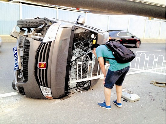 楚天都市报讯 (记者许洋)昨日傍晚6时30分,一辆小车从武昌岳家嘴往徐东大街方向行驶时,不慎撞上路边护栏,小车当街侧翻,一截护栏插入驾驶室内。司机随后被送往附近医院急救。